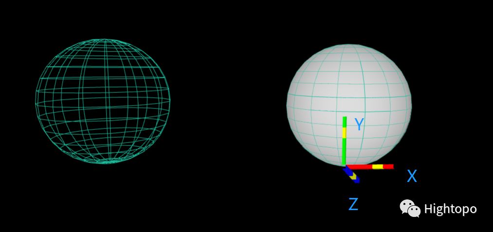 通过 3D 引擎,我们可以生成立体图形,也可以添加导入的模型,图形的位置由 x、y、z 三个方向的坐标来确认,而坐标轴汇聚的原点则是图形的锚点,无人机前方旋转的圆环则是将锚点调整到圆环中心后,操纵 rotation 属性进行转动 。在系统中线框状态的无人机则是像图中左侧的球体这样生成的,如果我们将图形的透明度调为 0,则只显示线框的样式。