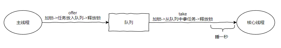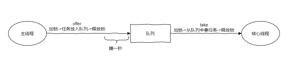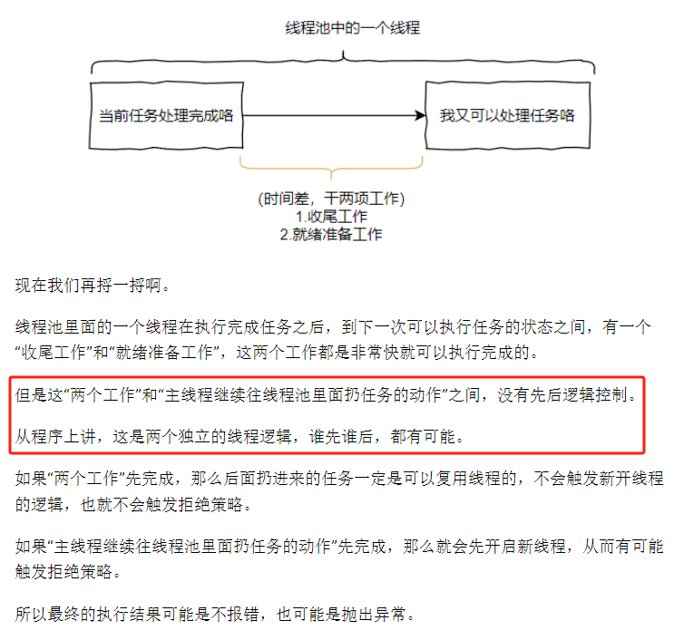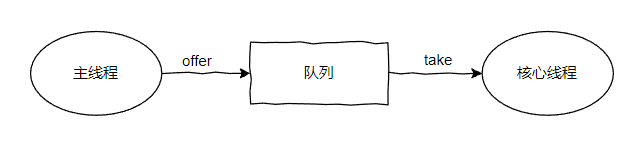 如果队列的长度只有 1,但是 for 循环一次要提交两个任务的时候,能否放成功,取决于核心线程从队列中拿(take)任务的动作,和主线程往队列里面放(offer)任务的动作,这两个动作之间的先后顺序。