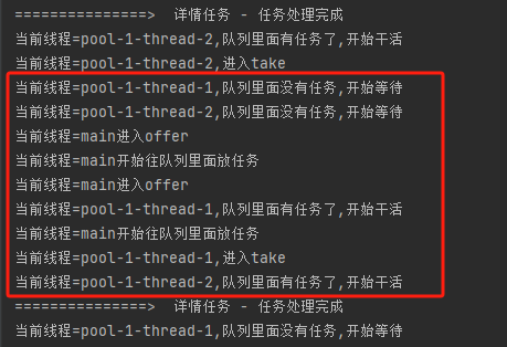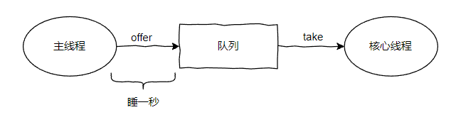 按照我们前面的推理,这样理论上可以达到主线程 offer 一个进去,核心线程就 take 一个出去的效果,程序一定就会正常运行结束。