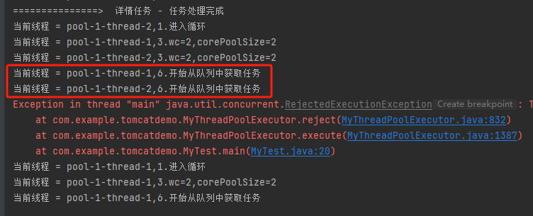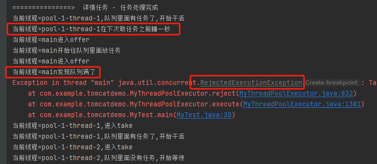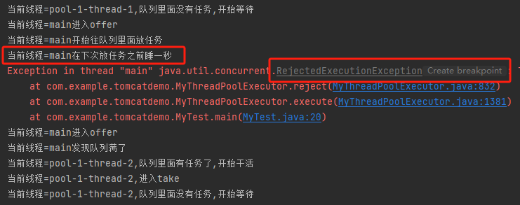 核心线程数等于最大线程数,都是 2,队列长度为 1,按理说这个队列最大可以容纳 3 个任务运行,但是一次性扔 2 个任务进去,会触发拒绝策略。