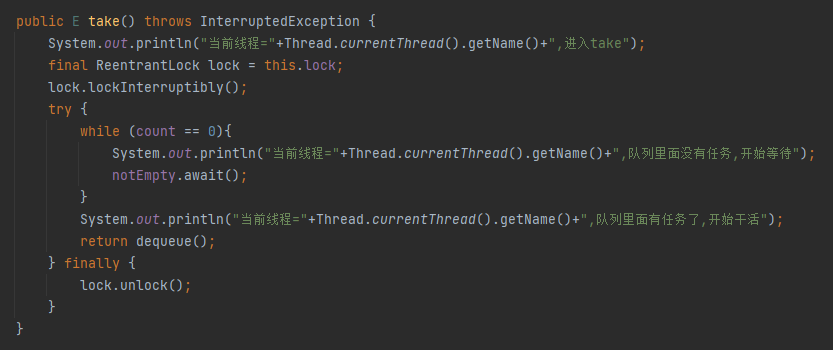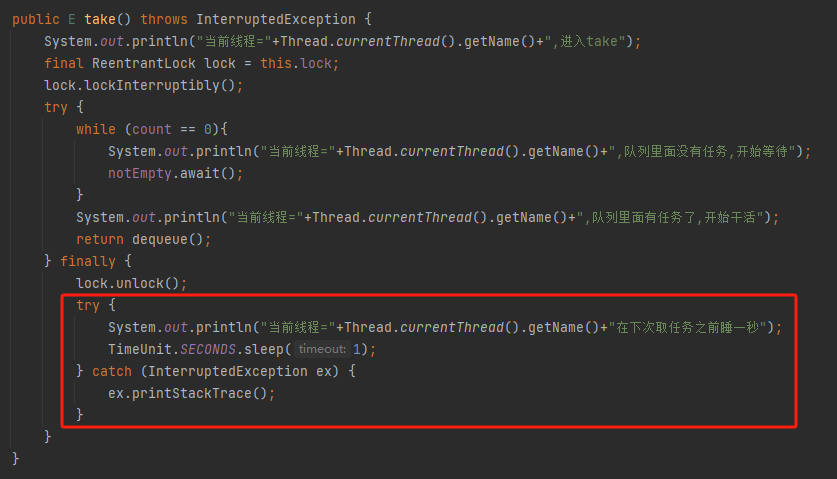 因为可以确定线程是直接运行到 take 方法了,所以为了减少日志输出干扰,之前加的输出语句全部清除。