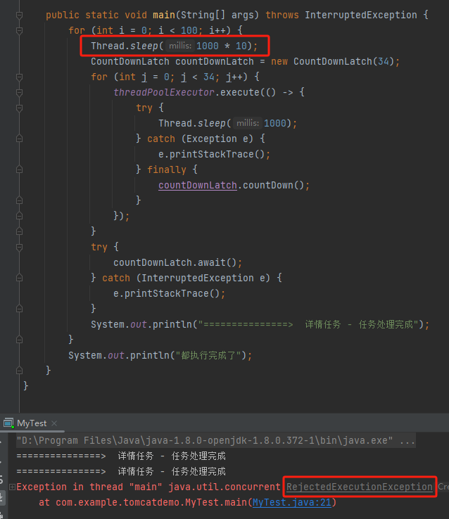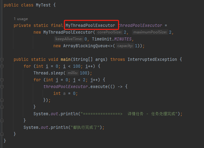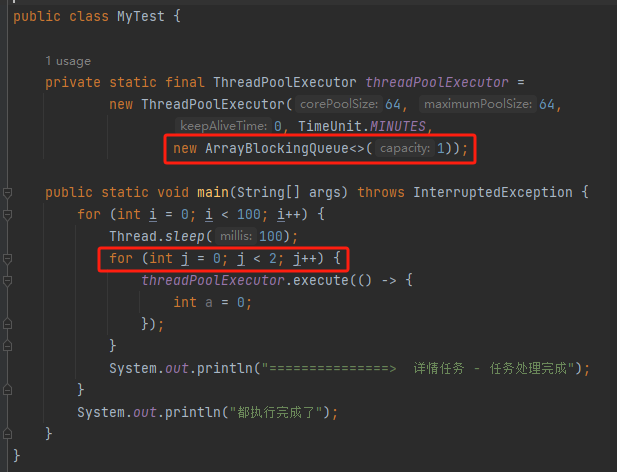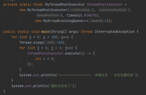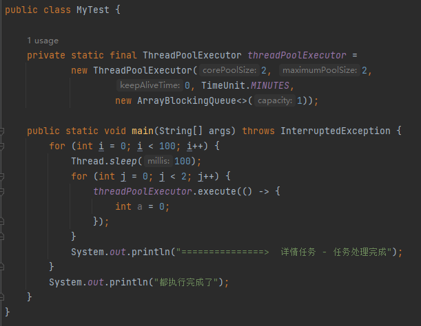 他在主线程中睡了 2s,目的是为了让“主线程继续往线程池里面扔任务的动作”足够的慢: