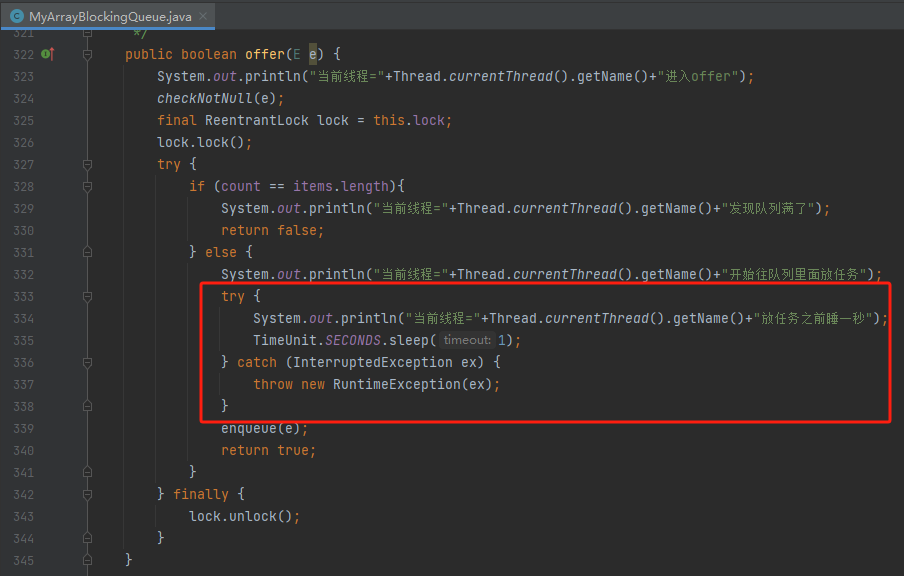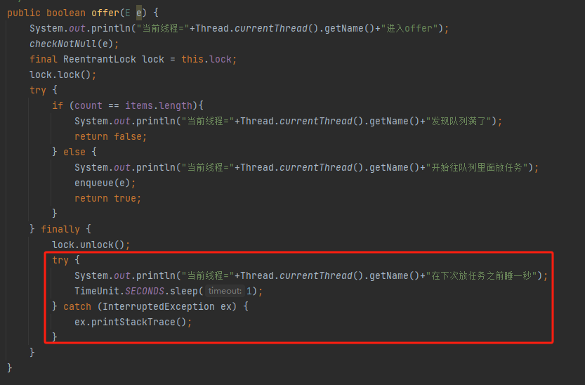 也就是这样,在 offer 方法里面,往队列里面放任务的时候,睡一下: