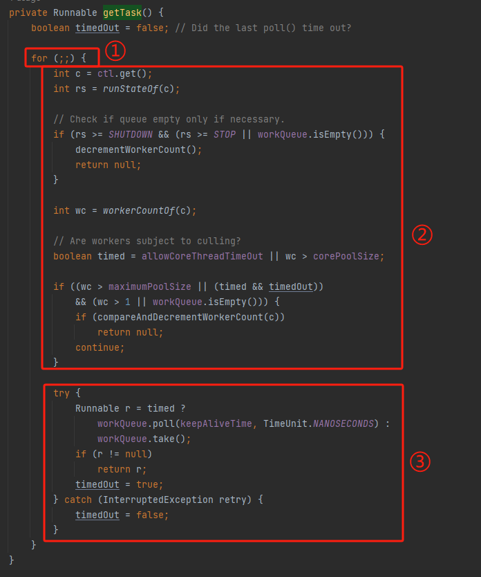 如果线程能运行到标号为 ③ 的地方,那么说明一定是就绪了,可以从队列中获取任务。