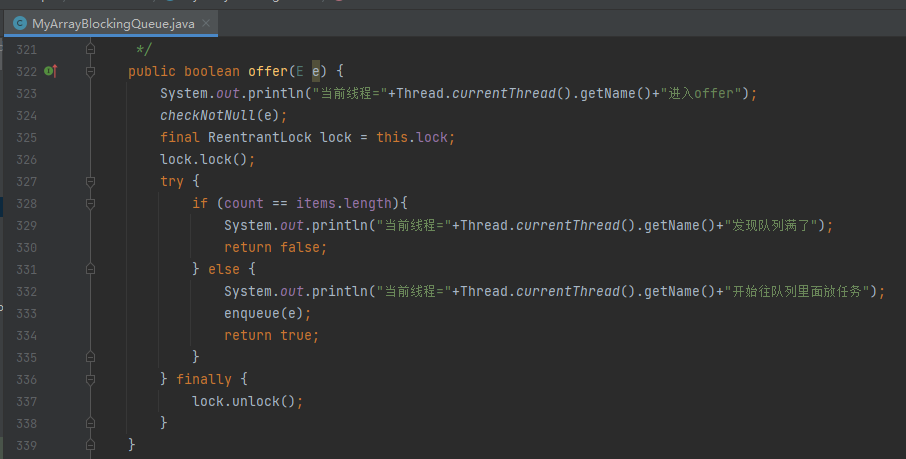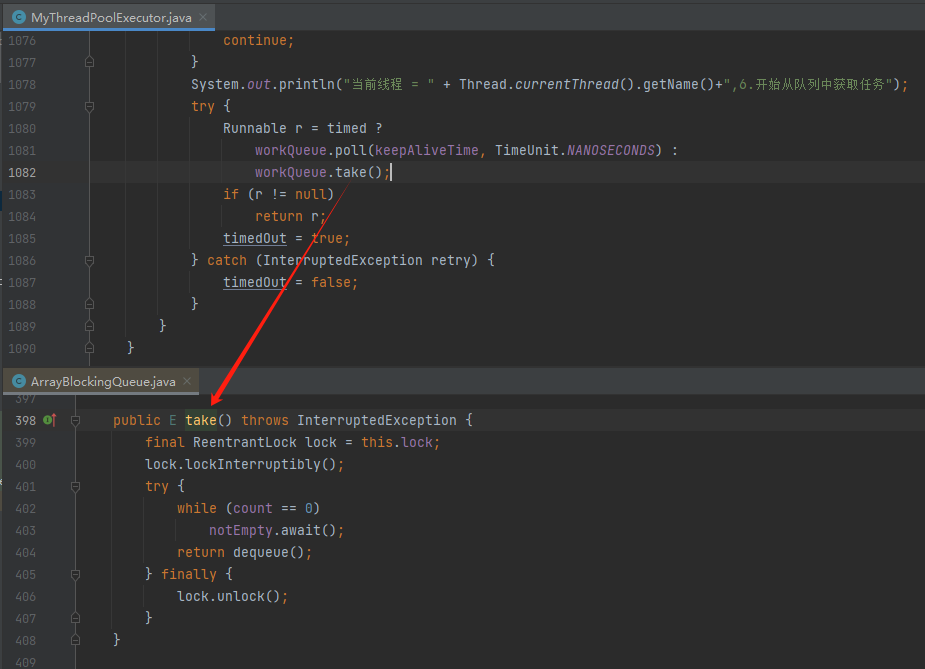 我也想在这个 take 方法里面加点日志观察一下,同理我也把代码原模原样的粘一份出来,作为我的 MyArrayBlockingQueue,并替换线程池里面的队列: