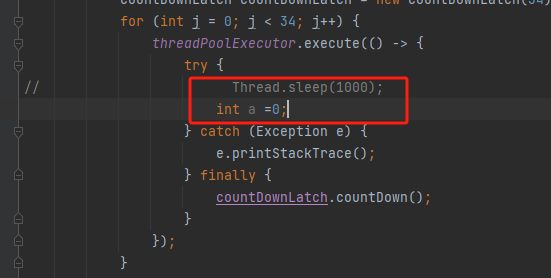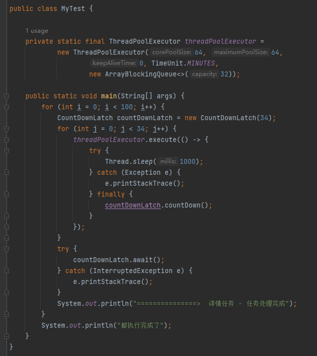 但是从代码可以看出,由于有 countDownLatch 的存在,可以确认 for 循环一次一定只会放 34 个任务进来。