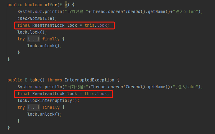 offer 和 take 方法都要拿到锁之后才能进行入队、出队的动作。