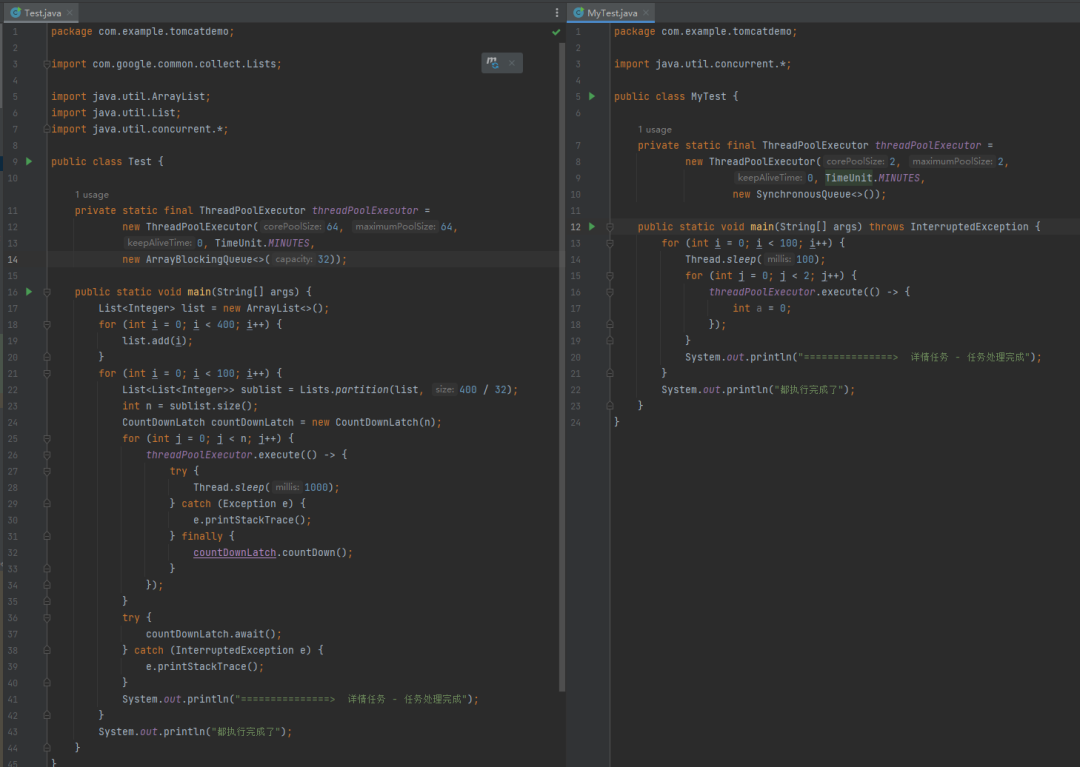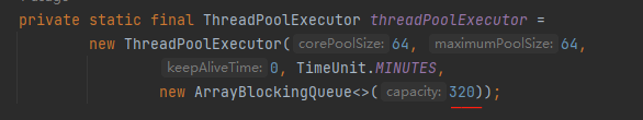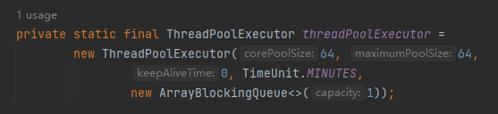 private static final ThreadPoolExecutor threadPoolExecutor = new ThreadPoolExecutor(64, 64, 0, TimeUnit.MINUTES, new ArrayBlockingQueue<>(32));