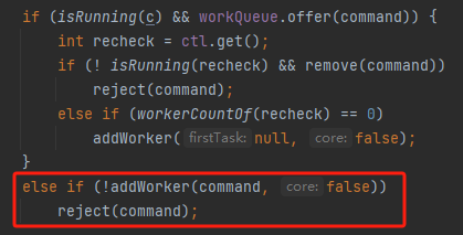 而在我们的案例里面,最大线程数等于核心线程数。所以没有线程拿来新增了,addWorker(command, false) 方法就会返回 false,所以触发了拒绝策略: