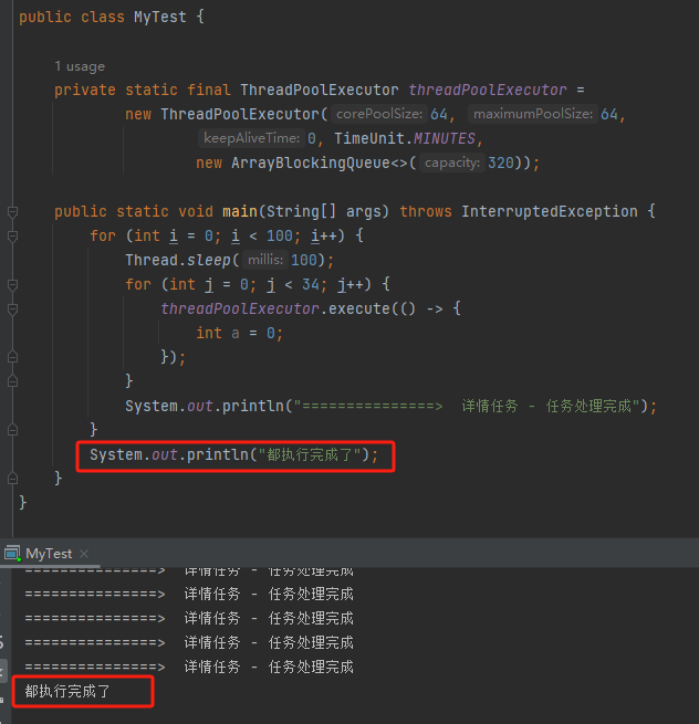 但是这里有两个条件,所以其实还有一个验证方式:让“主线程继续往线程池里面扔任务的动作”足够的慢,让线程池有足够的事件去收尾,这样问题就一定不会出现。