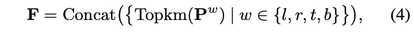 DGQP是GFLV2的核心组件,通过小的子网将预测的分布的统计信息转化为IoU标量,用于生成分类-IoU联合特征。跟GFLV1一样,将每条边的相对距离作为回归目标,每个bbox生成对应四个离散的分布,。如图1所示,分布的平坦情况能够反映bbox的质量,在实际计算中,论文选择概率分布的Top-k值及其均值,concatenate后作为基础的统计特征: