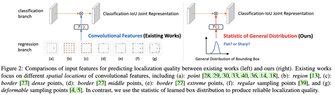 在当前的目标检测算法中,定位质量(Localization Quality Estimation, LQE)越来越得到重视。LQE不仅能够帮助留下高质量的预测框,还可以避免NMS的误消除。之前的方法大都从卷积特征直接进行LQE,如图2左所示,主要是特征采用上做文章,但实际上这些采样的特征更多是跟分类相关的。如前面所述,GFL预测的bbox分布信息与实际IoU有较强的关联性,于是论文将其融入LQE中,提出了GFLV2,如图2右所示。