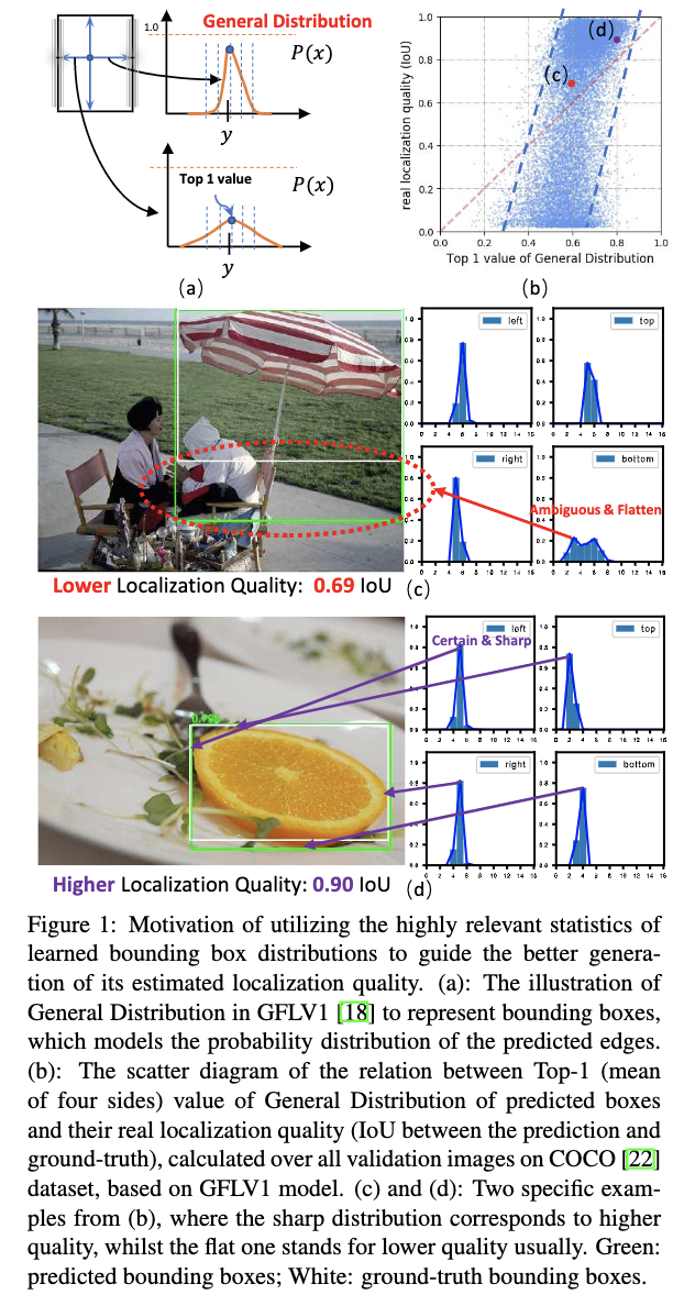 GFL系列方法将bbox的四个值预测转化为四个分布预测,能够在输出预测值的同时根据分布判断预测值的预测可靠性。如图1c和图1d所示,高可靠性的预测结果的分布较为集中,低可靠性的预测结果的分布则较为分散。另外,论文将GFL的每个bbox的四个分布的最大值的均值与实际的IoU进行了对比,发现有较高的关联性,表明GFL的分布预测效果还是不错的。