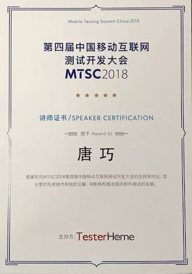 第一场是 TesterHome 主办的大会。我演讲的会场讨论的是测试质量保障的议题,我们的测试负责人离职了,于是我替她讲了。我演讲的主题是《2 个人如何保证 2 亿用户 App 的质量? — 小猿搜题的质量保证体系》,这个名字我刻意用了一下利于 PR 的描述,结果现场非常火爆。有意思的是,最后我演讲完没过多久,我们的测试负责人又从头条回来了。