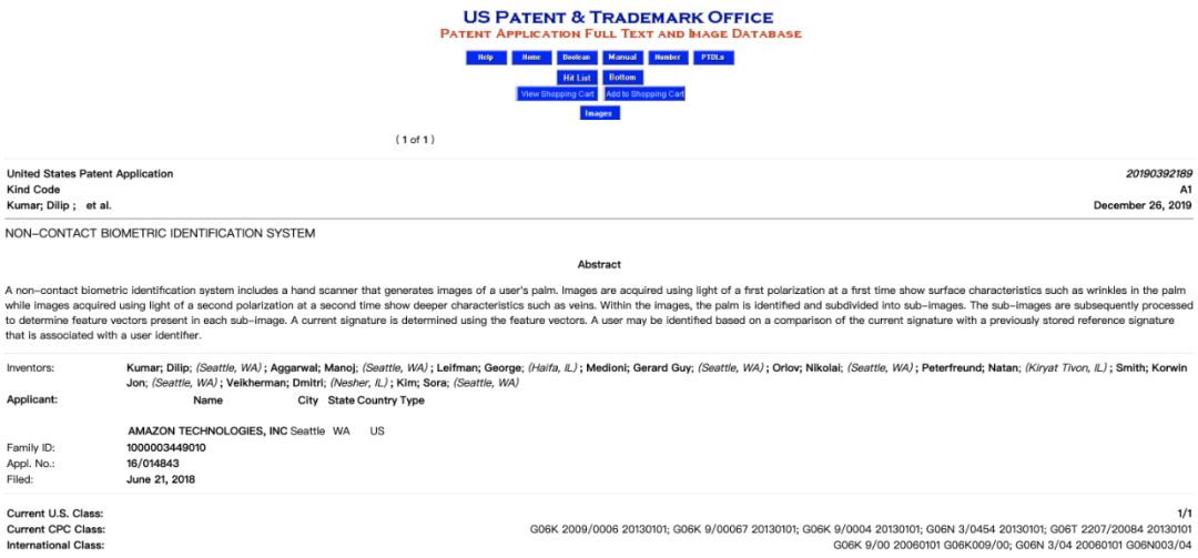在今年早些时候的报道中,亚马逊正在将这项技术应用在旗下全食超市的支付场景中。目前,该技术已申请了专利。从文档来看,亚马逊是在 2018 年 6 月份申请的。![]()
