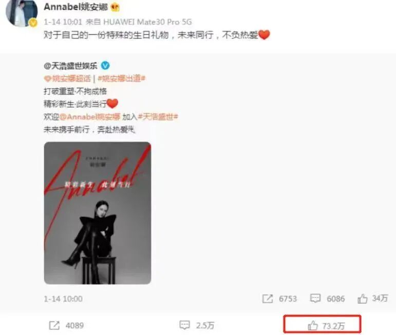 至今还记得,姚安娜官宣进入娱乐圈当天,直接上了热搜第一,声势浩大,一个官宣出道的微博,点赞量就是73万+。