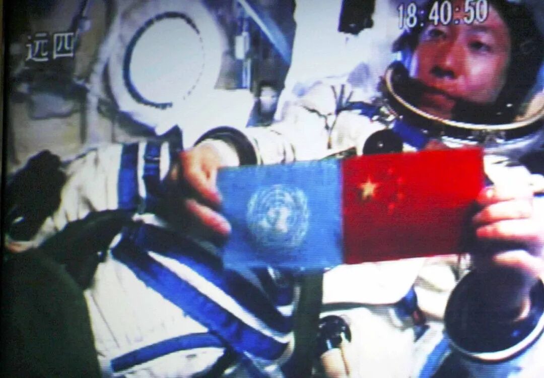 △杨利伟在太空中展示中国国旗和联合国旗帜