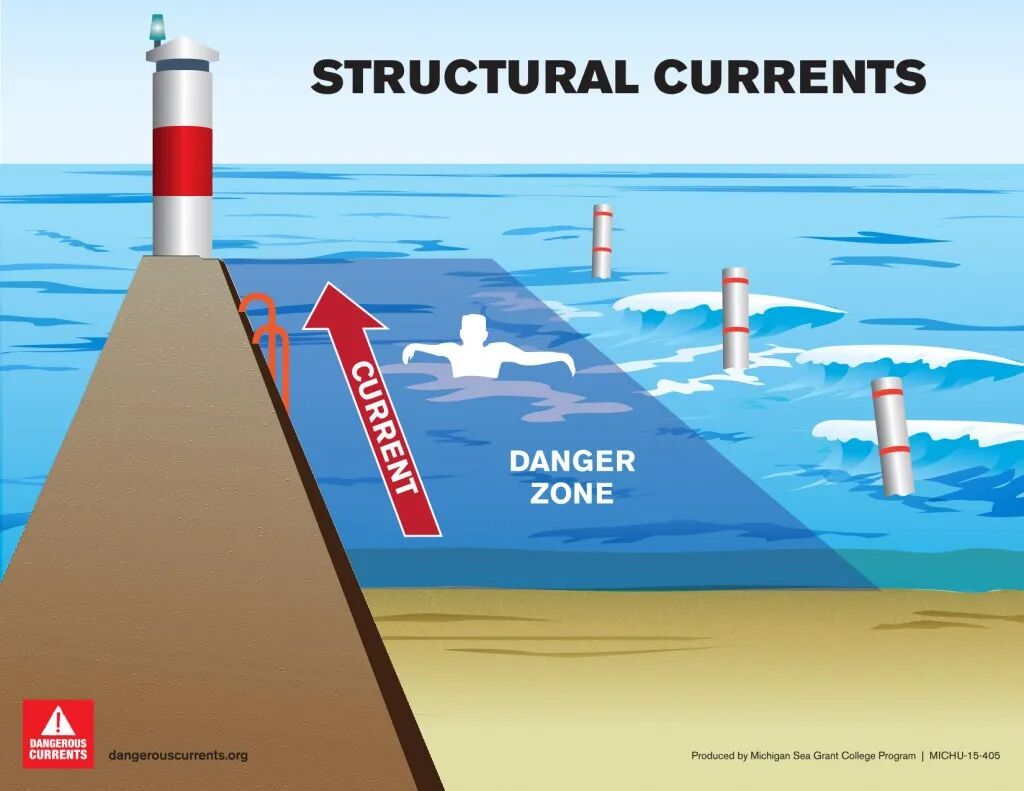 和离岸流一样,结构流也很难挣脱。这就是为什么救生员会让大家不要在防波堤附近游泳。