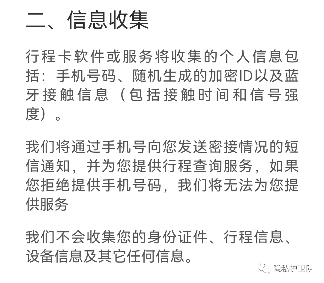 此外,还会收集随机生成的加密ID以及蓝牙接触信息(包括接触时间和信号强度),并承诺“我们不会收集您的身份证件、行程信息、设备信息及其它任何信息。”