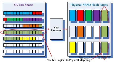 在这个背景下,间接寻址单元(Indirection Unit, IU)的作用及其对SSD寿命的影响显得尤为重要。在SSD内部,逻辑地址到物理地址的转换是通过一个称为“逻辑到物理映射”(Logical to Physical mapping, L2P)的机制实现的。L2P映射表通常存储在设备RAM中,用于将主机发送来的逻辑块地址(LBA)对应到NAND闪存上的实际物理位置。为了优化资源使用和提高效率,SSD引入了间接寻址单元的概念,即将多个连续或非连续的逻辑块映射到单个物理块上。