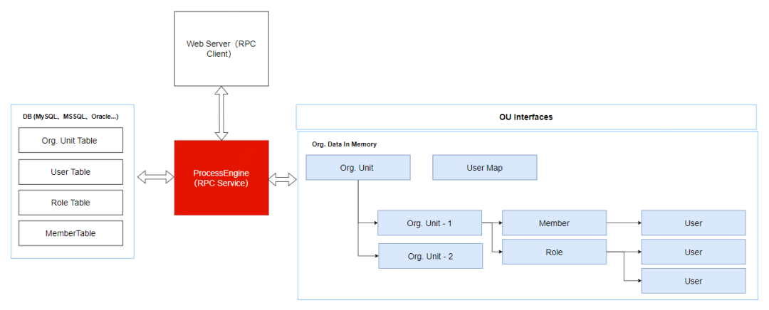 按照同一棵组织架构树进行数据维护,界面一般显示为左树右表。大多数商业化产品,都会将此组织架构树进行内存缓存,以方便审批人查找、开窗选择 OrgUnit、Role、User、Member 等场景。Member 的引入是为了解决一人多职等场景。一般发起流程的时候,需要带出发起人拥有的 Member 列表,从而后续节点取合适的审批人。