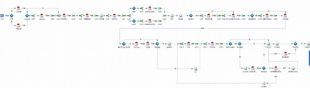 一个屏幕截图都截不完的流程,如果用代码去实现整个流程,其工作量和效率,可想而知。而实际做项目,使用基于流程引擎的产品来做项目的时候,只需要确定节点、节点配置、数据配置和权限即可。