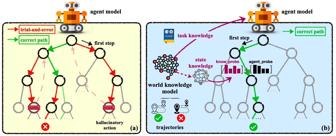 基于大型语言模型(LLMs)的Agent在全局规划中容易进行无脑试错,在局部规划中生成幻觉动作,因为它们对“真实”物理世界的理解不足。人类在面对特定任务时,会利用丰富的先验知识在心中预演整个过程,然后才采取行动,这种知识被称为全局任务知识。在任务过程中,还会不断维护一种局部状态知识,代表对当前世界状态的认知。缺乏世界知识会导致在早期规划阶段出现盲目试错,在后期则可能导致对当前世界状态的混乱认知并生成幻觉动作。