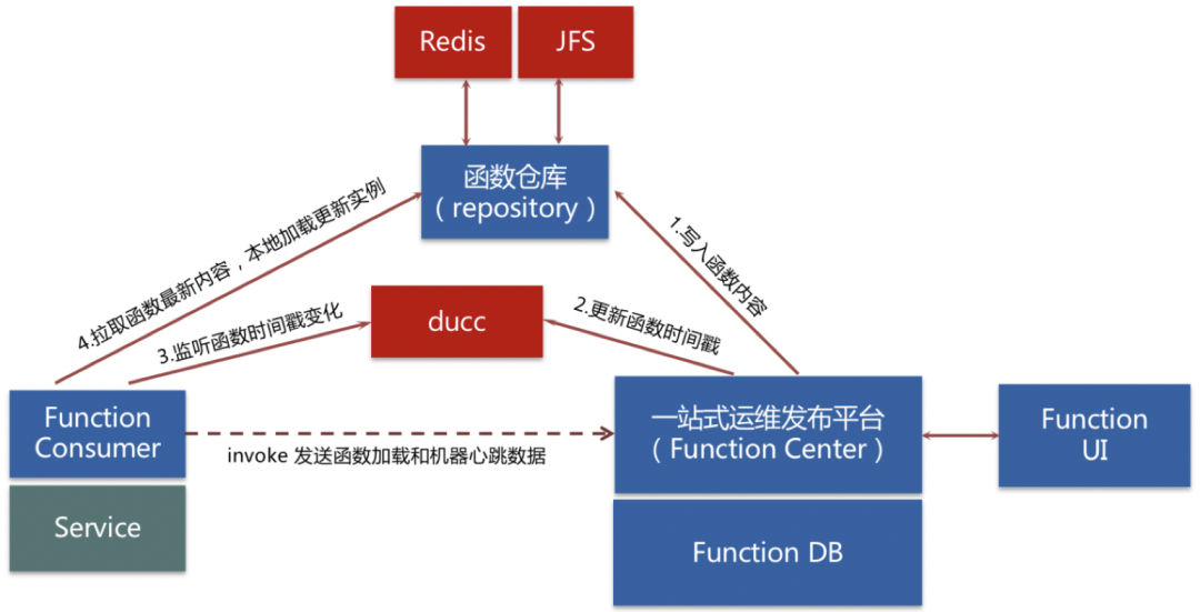 通过分析梳理通天塔内部各应用实际可落地的FaaS场景以及考虑到各应用对时效性的高要求,通天塔FaaS平台一期主要实现应用方以集成SDK的方式本地加载运行FaaS平台编写的函数,所以FaaS平台整体的核心架构主要是由集成SDK、一站式运维发布平台、DUCC(京东分布式配置管理平台)、JFS(京东文件存储系统)组成。诚然当前FaaS平台并非真正意义上的FaaS产品,并没有中心化运行和弹性伸缩的能力,可以理解为当前版本是我们对FaaS的初步探索和落地,后续我们会逐步演进升级架构,迈向真正的FaaS。