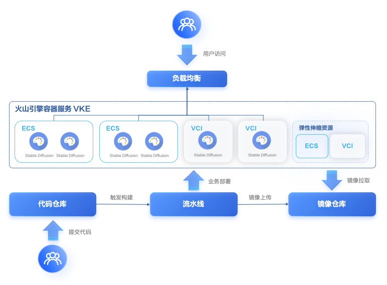 上图是一个较为完整的文生图模型推理业务架构示意图,展示了一个在线推理业务在训练好模型后的业务部署流程:通过 CI/CD 流程,我们可以快速完成从代码提交到编译构建、容器镜像制作和发布的整个流程。
