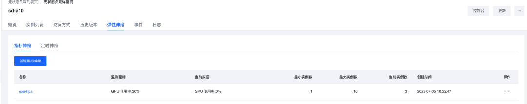 火山引擎容器服务 VKE 能根据业务流量自动弹性扩容或弹性自愈,保证业务平稳健康运行,它无缝集成弹性容器 VCI,可以实现海量实例快速秒级启动,帮助用户灵活应对业务高峰。以我们之前部署好的 Stable Diffusion WebUI 业务为例,我们可以在 VKE 中进行配置 ,实现通过 GPU 指标进行弹性伸缩: