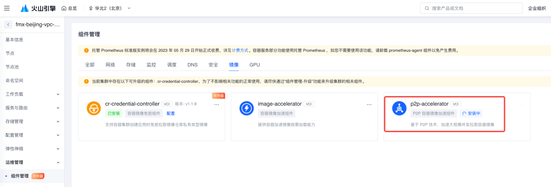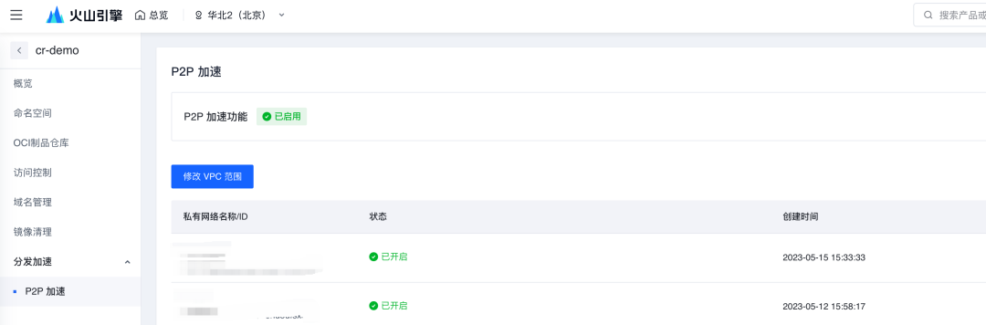 首先我们需要有一个镜像仓库 CR 的标准版,然后开启 P2P 加速,设置 P2P 加速范围的 VPC,该能力会和 VKE 一起使用。