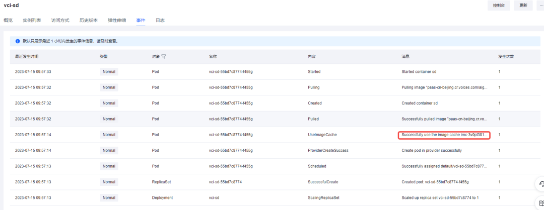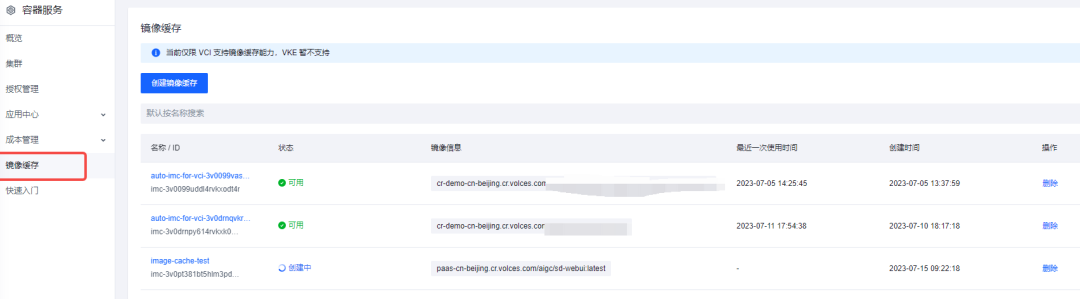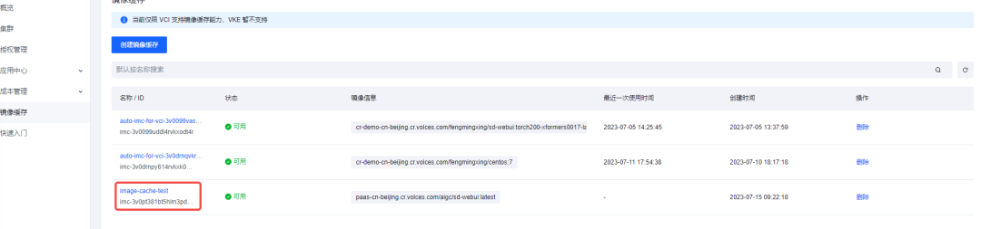 通过控制台查询创建好的镜像缓存,获取镜像缓存 ID 以供后续使用