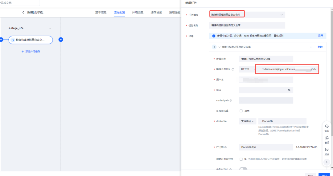 选择推送到自定义镜像仓库,配置火山镜像仓库的地址。