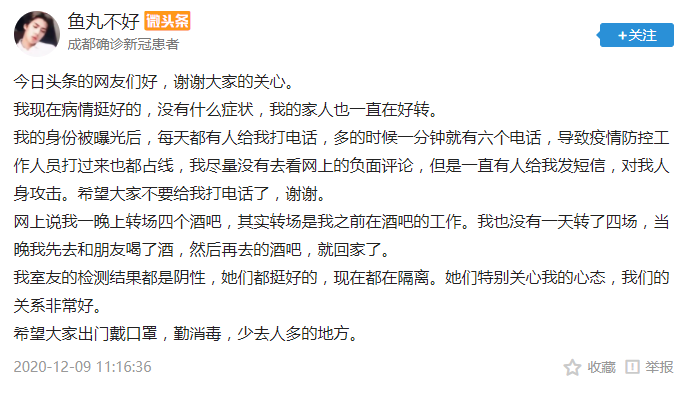她澄清自己之前的工作是在酒吧负责气氛和营销。当时不知道奶奶确诊,如果知情,肯定也不会出来。她同时表达歉意,称给成都市民带来了麻烦,打破了原本平静的生活,并希望大家都能配合防疫。