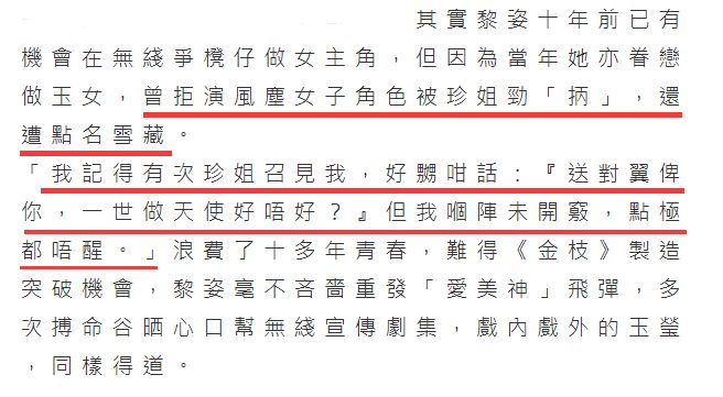 连曾励珍都骂过她:“不如送对翅膀给你,一辈子做天使好不好?”她还曾因为拒接风尘女角色被TVB点名雪藏。