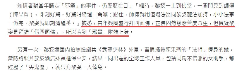 据说那时黄玉郎发现黎姿忽然性情大变,经常穿红衣服涂红唇,还会在深夜一个人外出游荡,黄玉郎就带她去找大师陈果齐“驱邪”……