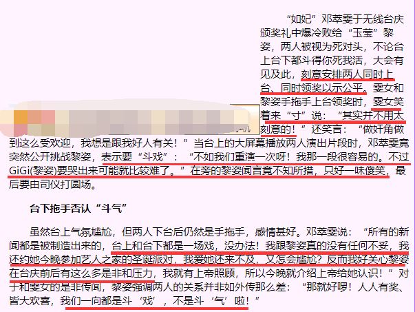 虽然下了台否认斗气,但一夜之间,两人不和的传闻满天飞。连带着黎姿“以约换奖”的“黑幕说”也出来了。