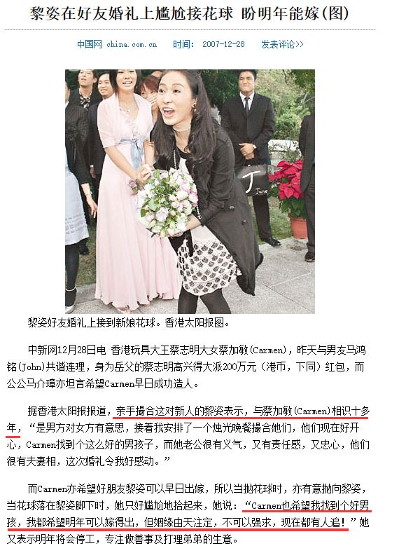 这些传闻到后来都不了了之,黎姿和蔡家的关系一直不错,2007年她还亲手撮合了蔡志明的大女儿蔡加敏的婚姻,在婚礼上接到了新娘的花球。