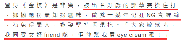 坊间有传,邓萃雯diss黎姿扮无知靓妹,拍了十多年戏还老是NG。黎姿就说她和雯女关系没有大家传的那么恶劣,拍剧期间雯女还帮她买眼霜。