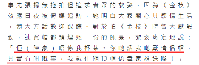 黎姿和男主陈豪传起了绯闻。不过她直接说了“陈豪不是我那杯茶”。