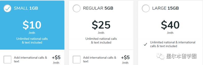 $10和$25的套餐都非常适合学生,分别有1GB和5GB的流量和无限量的国内通话和短信,如果是要开通国际通话和短信需要多付$5一个月: