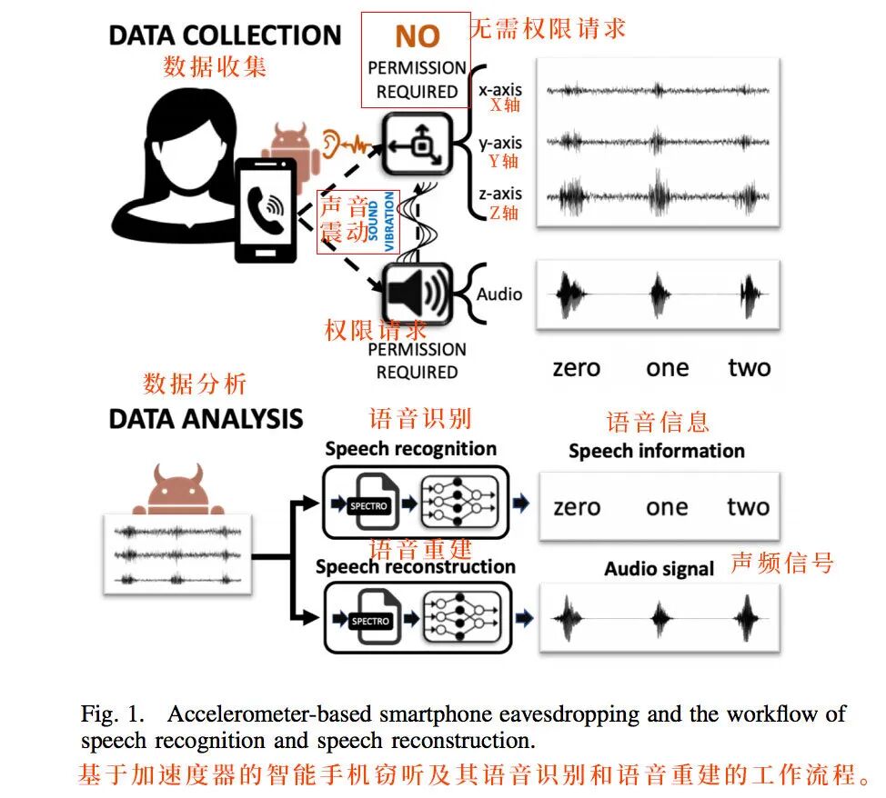 攻击者可以通过加速度传感器来收集手机发声所引起的震动信号,进而识别甚至还原手机所播放的声音信号。”