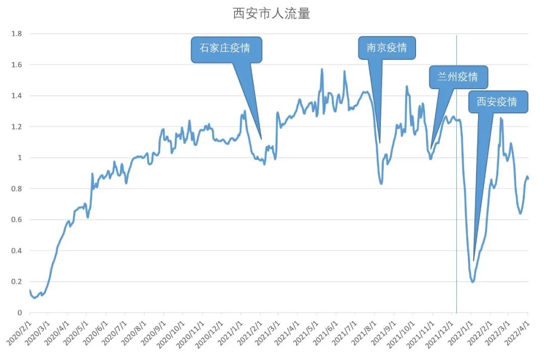 2月至今的每日人流量指数。可以看到,西安曾经有过四个因疫情造成的凹陷,前三次分别是2021