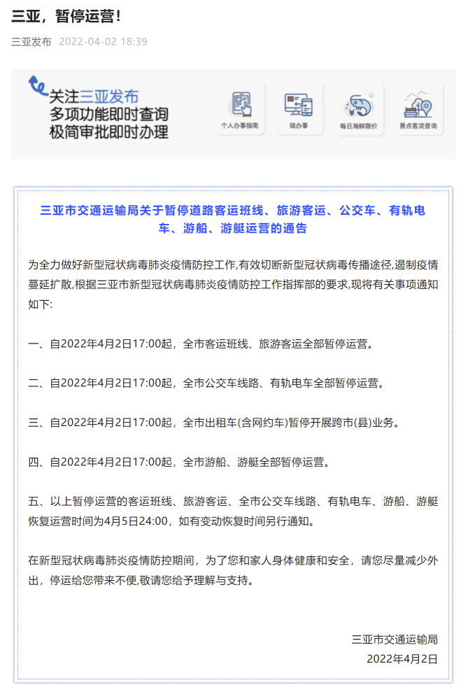 1例确诊病例和4例无症状感染者,这是三亚市一个月以来第一次出现确诊病例。同日,4月2日晚上17:00,三亚便暂停了整个城市的客运、公交、出租车、游船运营。