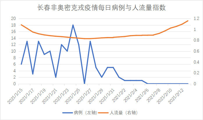 从下图的病例和人流量指数可以看到,长春整体的人流量下降并不明显,防控措施在