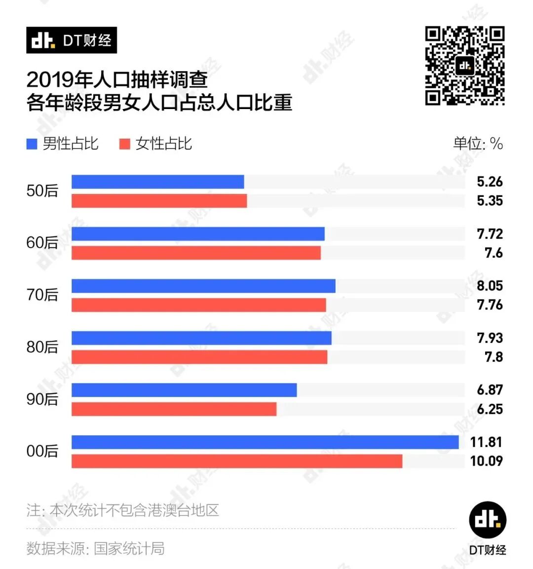 DT君通过2019年国家统计局的人口抽样调查数据算了下各年龄段的男女比例。如果你是50后~80后,还算比较幸运,男女凑合数量差不离。看看上图90后与00后中,女娃娃明显比男娃娃少了一大截。再联系我国老夫少妻的传统,70、80的大龄单身男青年还会娶走一部分“少妻”。根据现有规定,男25周岁、女23周岁以上结婚即为晚婚。已经步入晚婚阶段的90后男孩子们,你们以后的市场可能在00后的妹子那。至于00后的男孩,既然二胎现在全面开放了,只能耐心等待一下10后的性别比实现惊天逆转?投胎确实是技术活