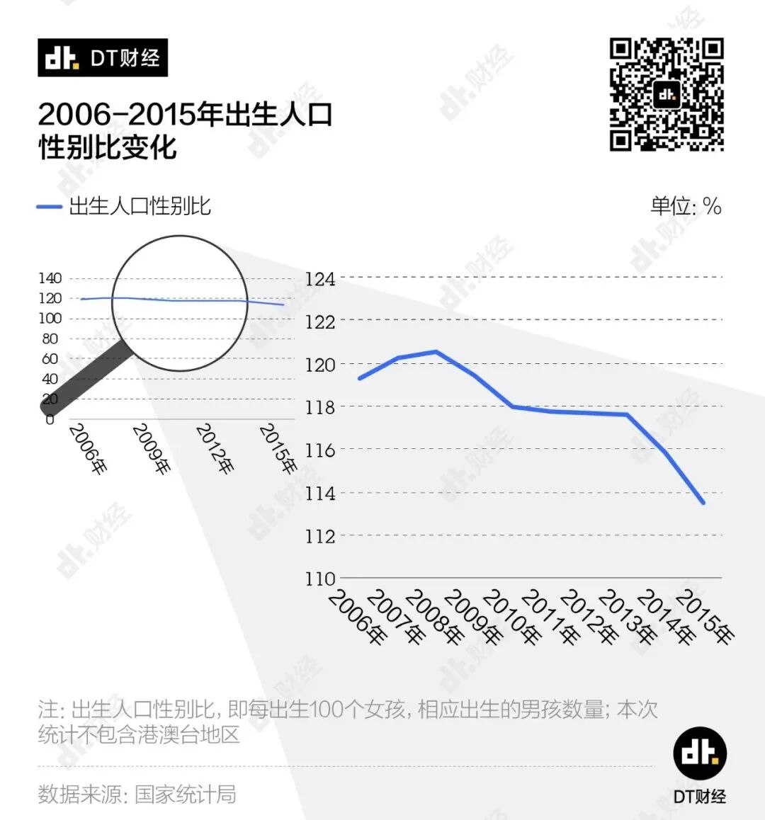 到了该结婚的年龄,发现女孩子不够?说到底是因为她们没有机会被生下来。一般来说,出生人口的性别比(每出生百名女婴相对的出生男婴数)正常范围为103-107,这样正常生长到了婚配的年龄后男女数量能大体相当。不要问DT君多出来的那几个可爱的男孩子怎么了,大自然会做出一些别样的选择。然而我国的出生人口性别比在2015年之前就没有低于过115,2007和2008年的数字甚至超过了120。这意味着什么呢?从出生开始,男孩子就比女孩子多出了至少20%。从增长趋势来看,中国的出生人口性别比在80年代出现向上的转折,跟计划生育的推行时间差不多重合。这事儿很好理解,中国素有重男轻女这种传统陋习,当只能有一个孩子之后,很多女孩子被提前扼杀了。这也是为什么这些年国家不准孕妇提前知道婴儿性别的原因。生得越晚,找媳妇越难