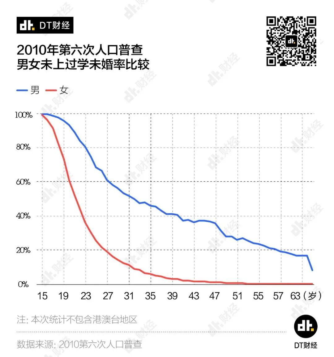 看完了地区再看看教育问题。让DT君来告诉你,为什么毛爷爷在延安这么艰苦的时期都要搞义务教育!DT君同样是按照第六次人口普查数据计算了不同学历人口的未婚率。数据告诉我们,当大家都读到了研究生阶段,男女在各个年龄段的未婚率相当接近。到了四十好几,不管怎样都是能结婚的。然而,如果看看那些没太上过学的朋友们,男女未婚率出现了极大分化。女性未婚率还是正常走向,跟上图比较的话,还会发现没有上过学的女孩子比一路读到研究生的同志们更容易结婚。但这不是重点,男性的未婚率在下图中实现了全年龄段高涨。你没看错,高达20%未上过学的男孩子一不小心就终身未婚了。这个问题想想有点悲哀,问题归结到最后可能就是一个字:穷——没文化就没好工作,没好工作就没钱,没钱就娶不上媳妇……所以,如果不幸人丑家贫,多读书绝对是拯救单身的最佳途径。上面说了这么多,回归自身,其实你光棍的原因都在某位DT君不可考的高能网友总结的这张图里:![]()