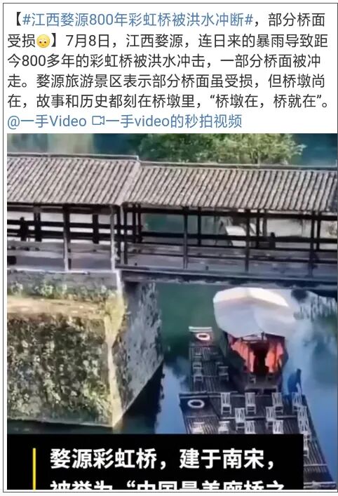 江西婺源修建于南宋时期的800年彩虹桥,顷刻之间被洪水冲断。