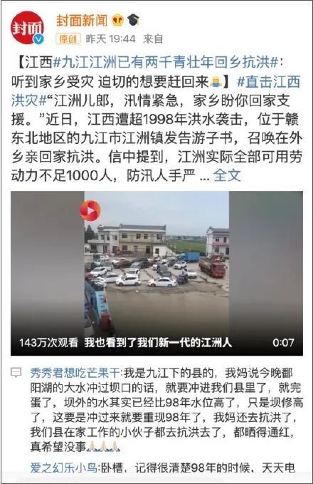 就在昨天,江西江洲镇,全镇老幼撤离,2000青壮年不计代价从外地回家乡抗洪,和村庄共存亡。
